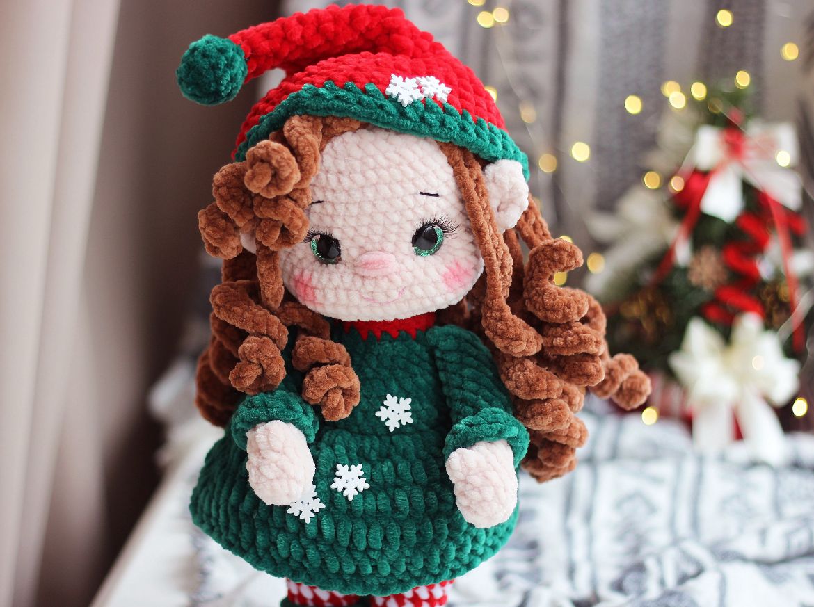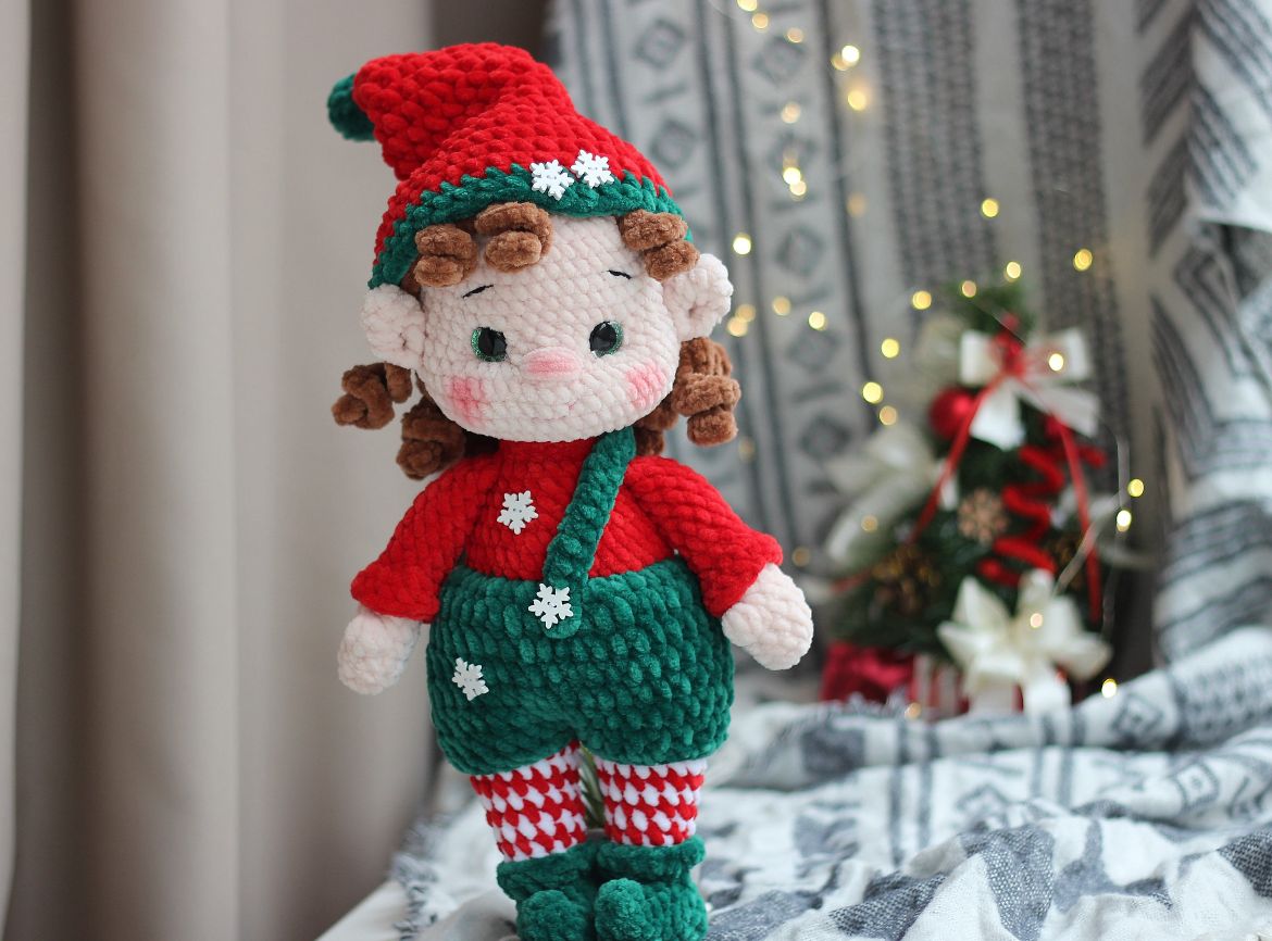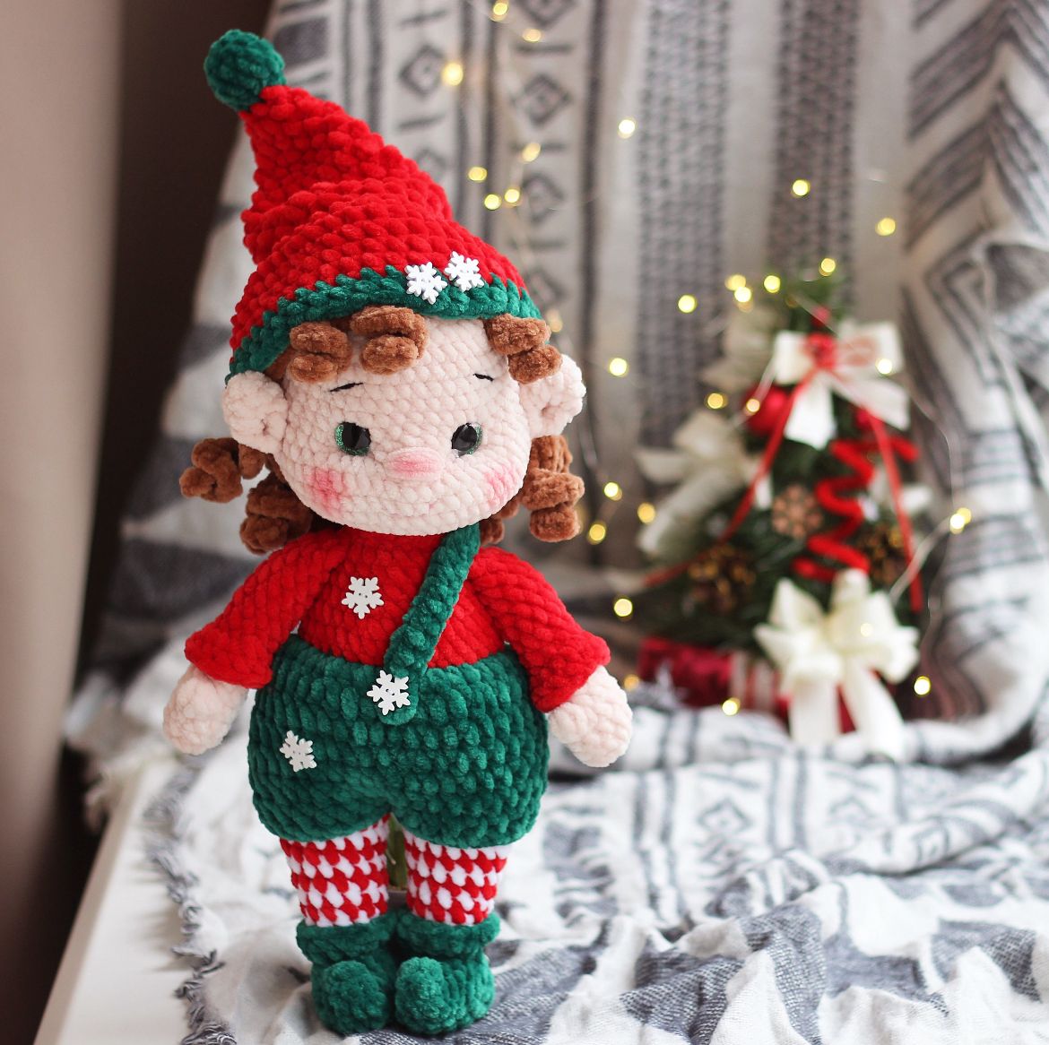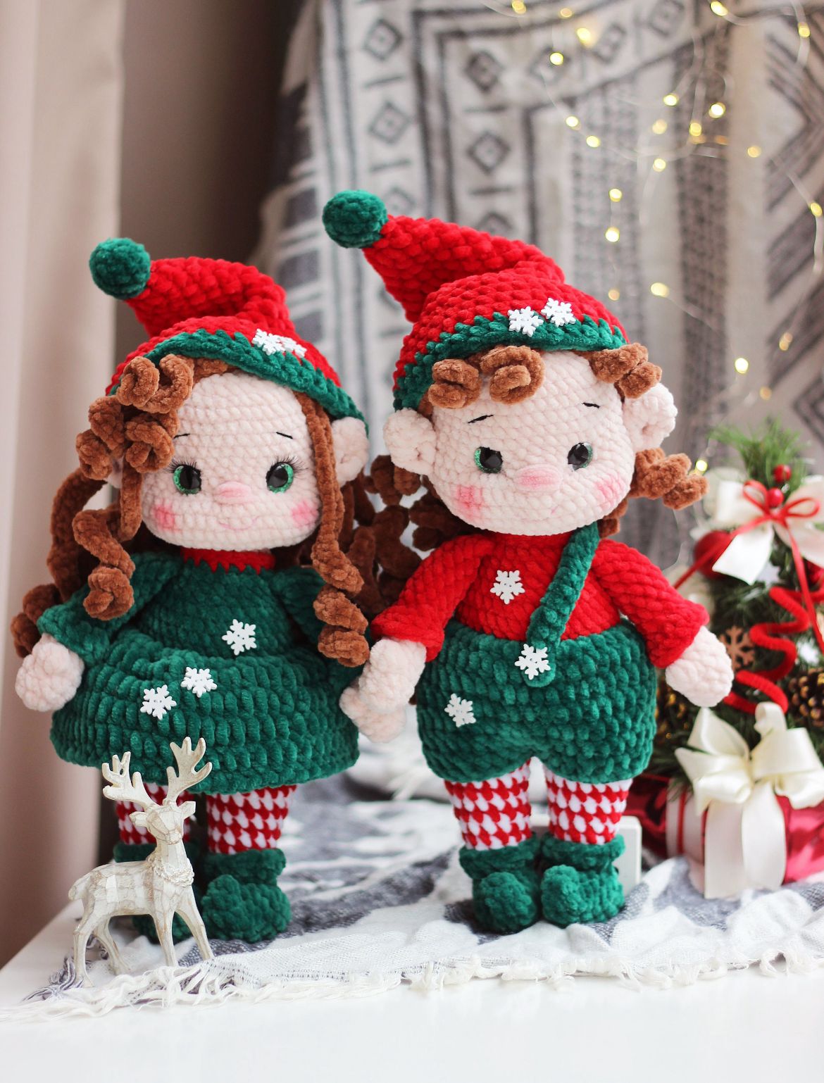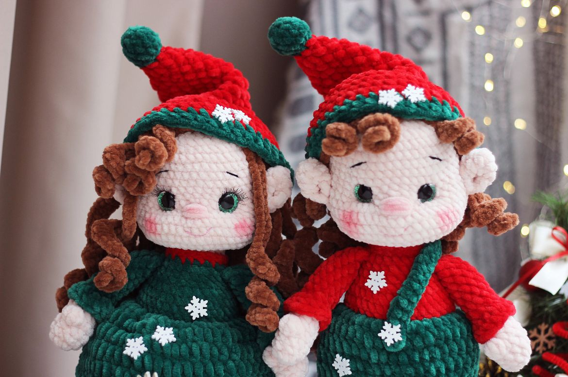 Ein festliches Duo: häkle zwei fröhliche Weihnachtselfen mit Lockenhaar, gestreiften Beinchen, Elfenschuhen und roter Weihnachtsmütze. Perfekt als Weihnachtsdekoration oder einzigartiges handgemachtes Geschenk.