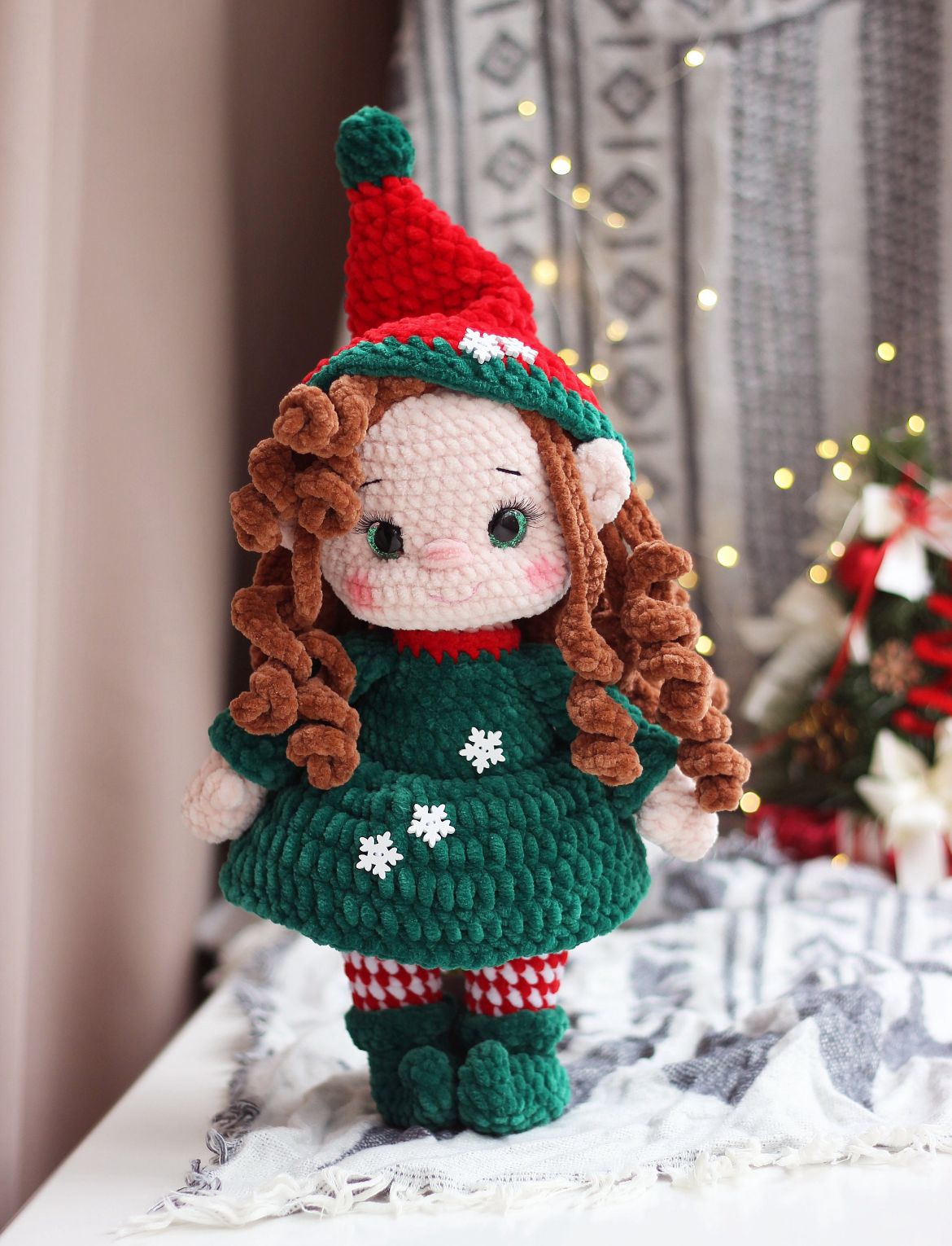 • Festliche Details: gestreifte Weihnachtsbeinchen (rot/weiß), grüne Elfenschuhe, rote Mütze mit Bommel 🎅
