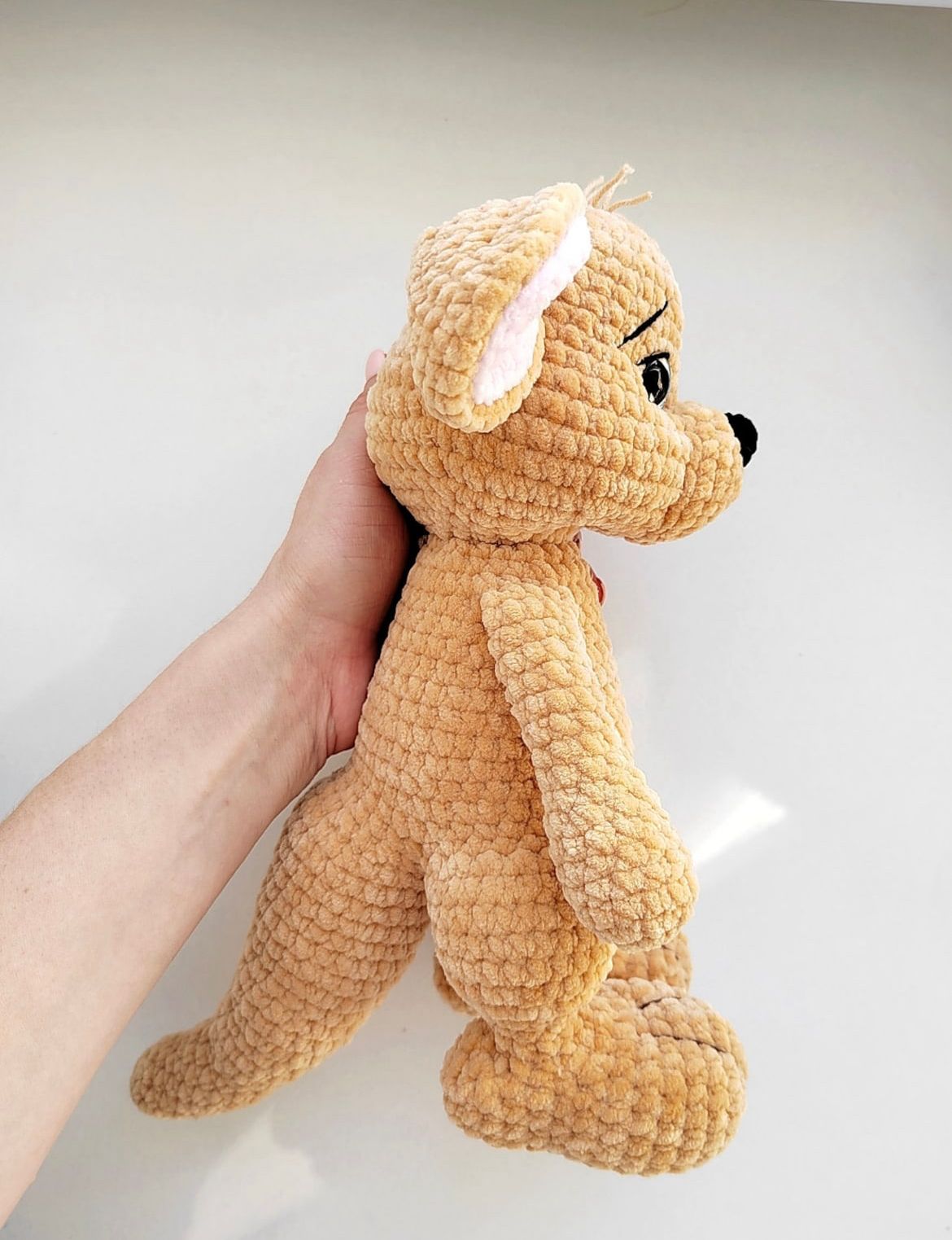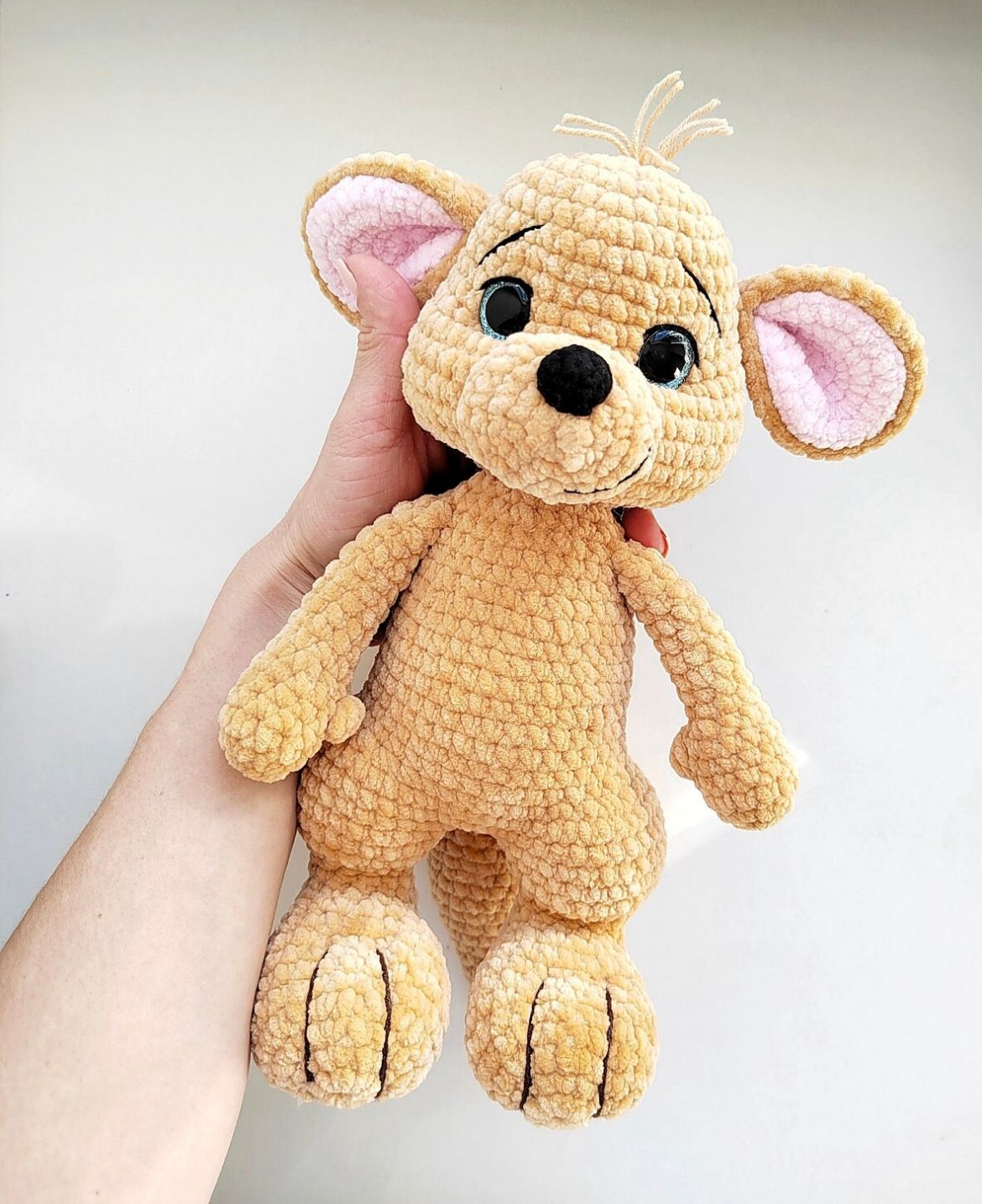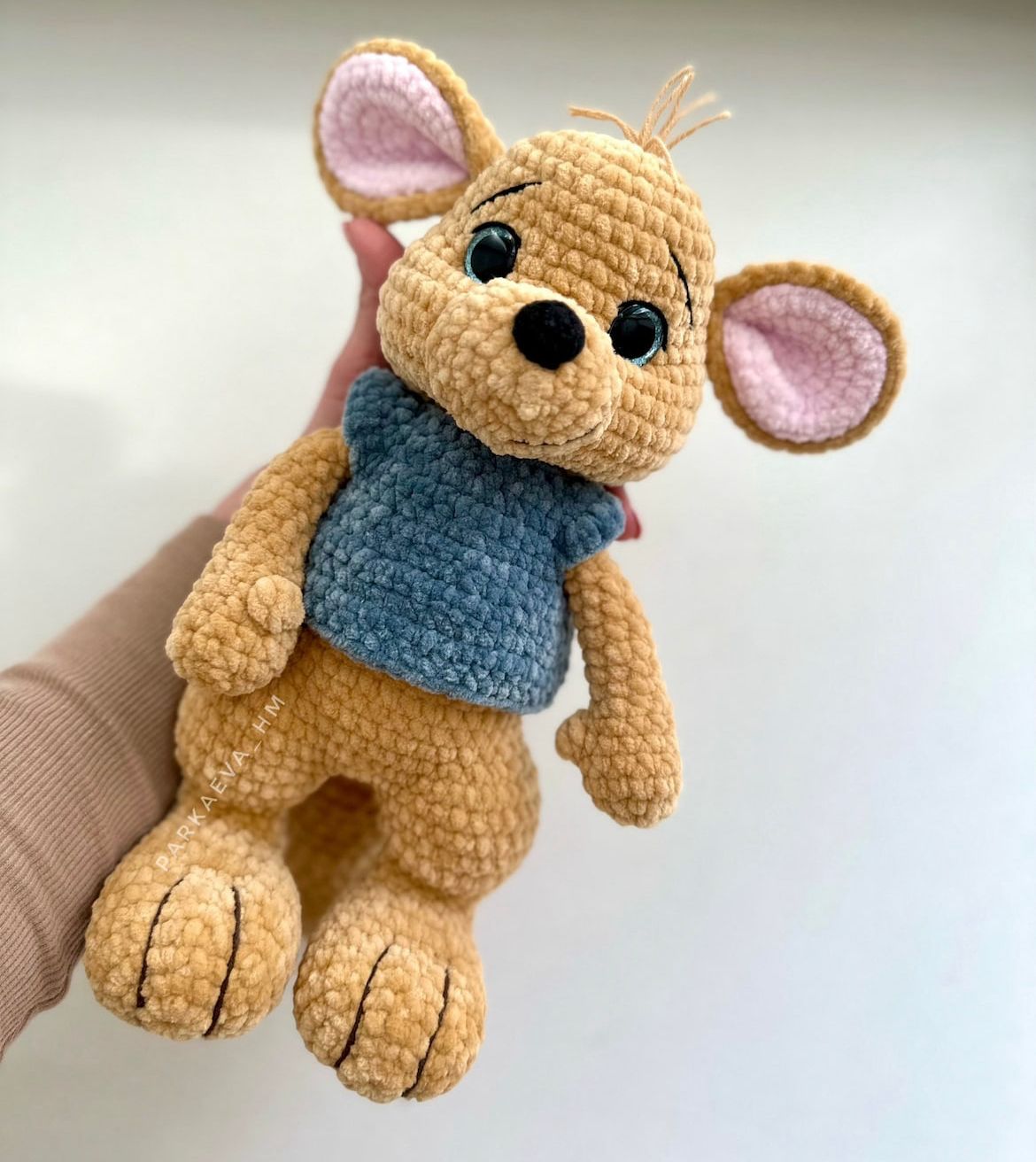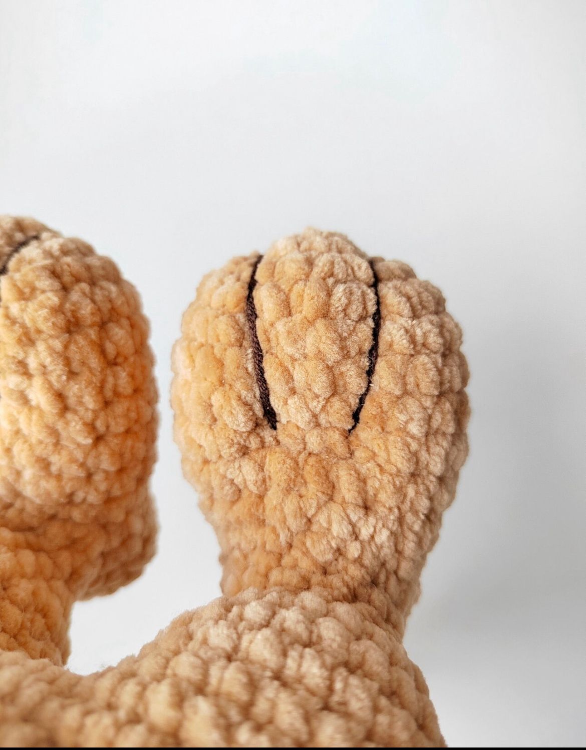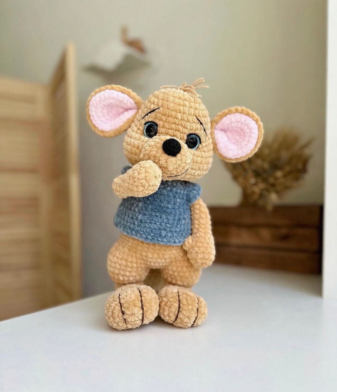 Plüschgarn (Wolans Bunny Baby oder Himalaya Dolphin Baby), YarnArt Jeans für Details, Sicherheitsaugen (14–18 mm), Füllwatte, Häkelnadeln 3,75 mm & 2 mm, Knöpfe für die Jacke, Nadeln, Marker, Schere.