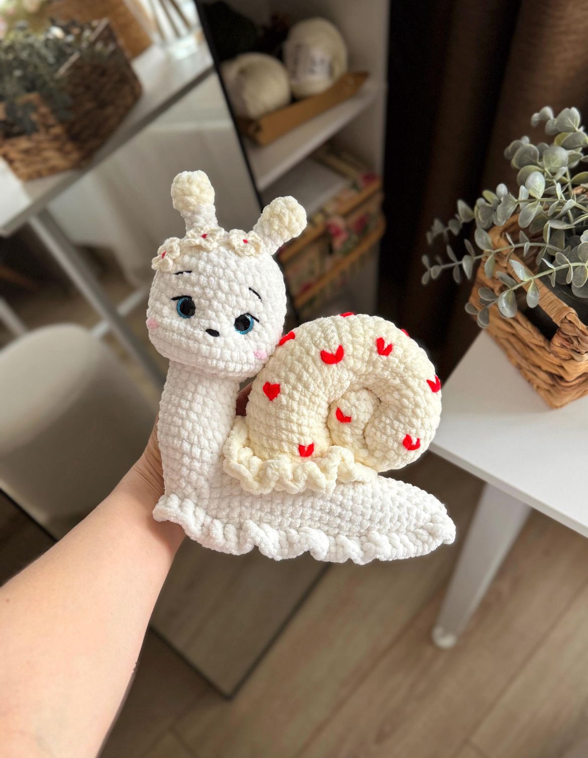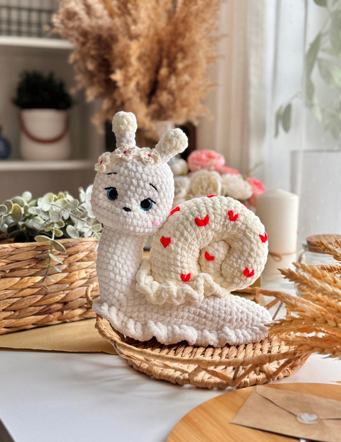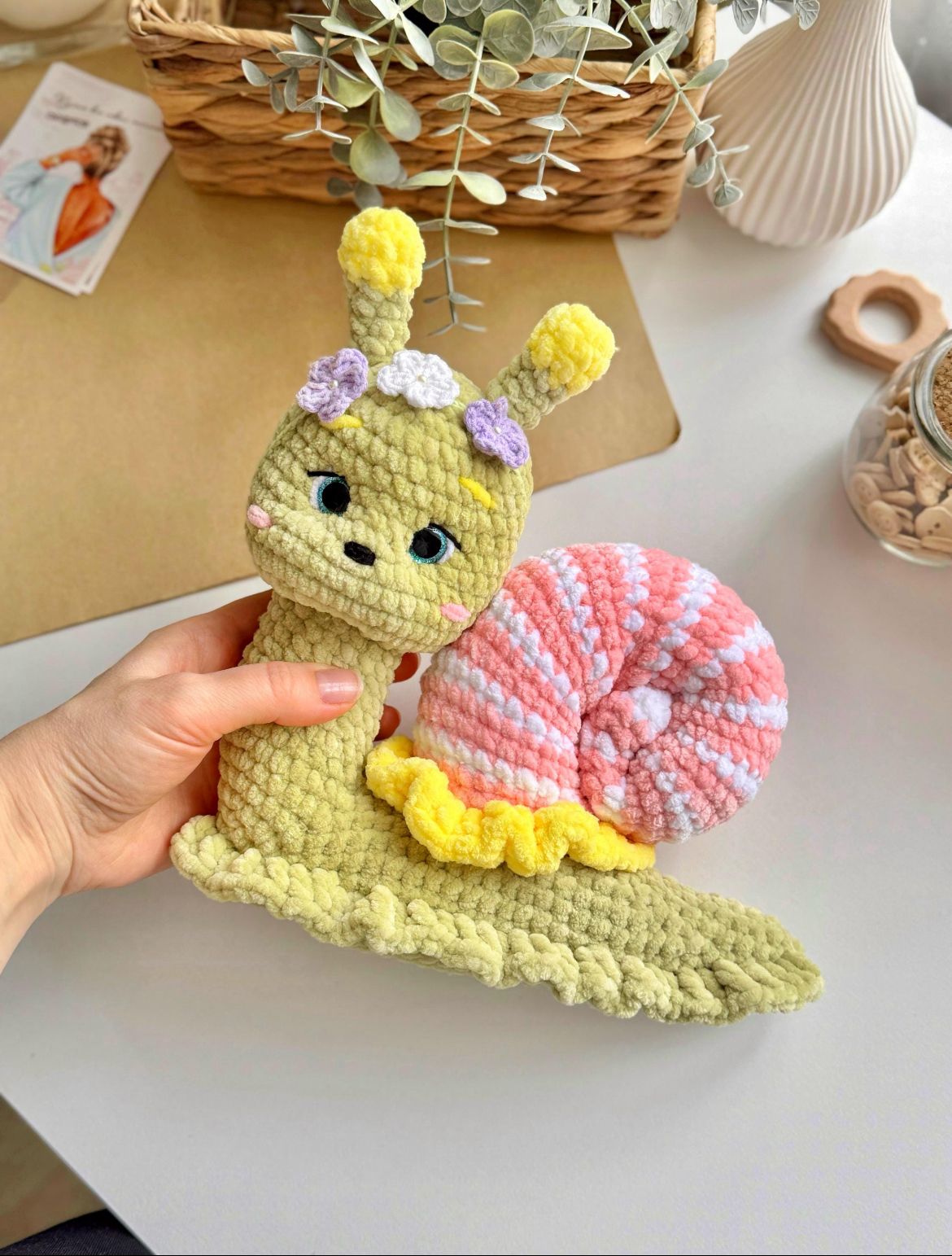 Warum einfach kaufen… wenn du diese allerliebste Plüsch-Schnecke mit eigenen Händen machen kannst? Mit diesem Muster häkelst du eine bezaubernde Schnecke mit Spiralhaus, Blumen-Haarband und liebevollen Details - perfekt als Kuscheltier, Babyzimmer-Dekoration oder einzigartiges Geschenk!
